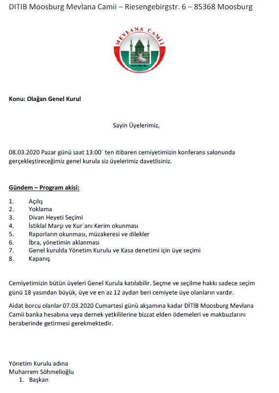 Yeni yönetim kurulumuz secilmiştir. Genç arkadaslarmizinda ağırlıkla katıldığı yeni yönetim kurulumuzu bu sayfada bulabilirsiniz: http://www.moosburgmevlanacamii.de/?q=mevlana-camii-moosburg-yonetim Moosburg cemaatımıza hayırlı olmasını diliyoruz!
